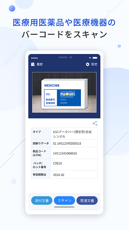 Legge il codice a barre GS1 visualizzato sulle confezioni di farmaci etici, dispositivi medici, ecc. e recupera foglietti illustrativi elettronici e relativi documenti sul sito PMDA (Pharmaceuticals and Medical Devices Agency). Questa è un'app per professionisti medici sviluppata congiuntamente dalla Federazione giapponese dei produttori farmaceutici, dalla Federazione giapponese dei dispositivi medici e da GS1 Japan (Centro di sviluppo del sistema di distribuzione).