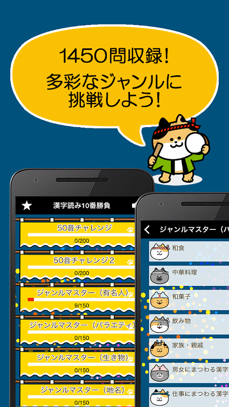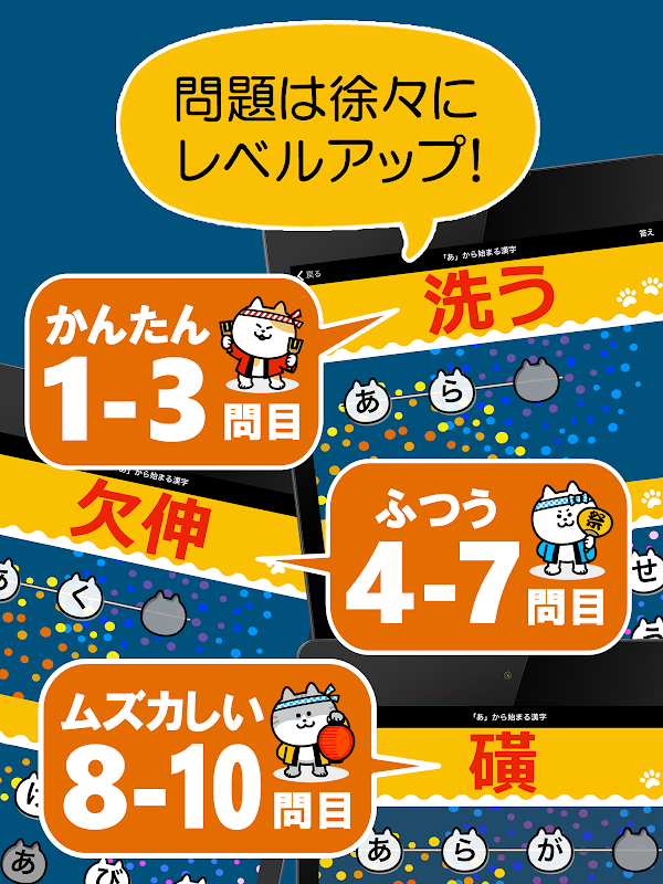 50音チャレンジの他、画数の多い漢字、有名人の名前、魚へんの漢字、戦国武将、体のツボなど、多彩なジャンルの漢字の読み方クイズに挑戦しよう!