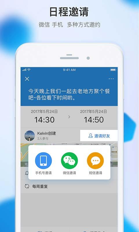 【日程邀请】你可以邀请通讯录好友或微信好友参与你所创建的日程,也可与好友直接共享你的日历;