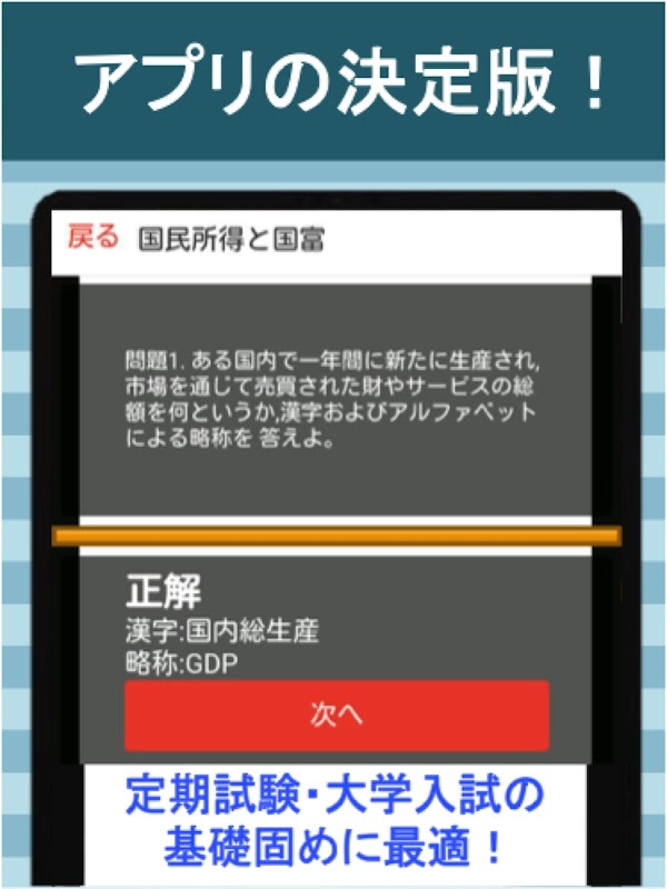 学校の定期テストや大学入試 センター試験ではほぼこのアプリにある知識問題と同じような内容が出題されるはずです。