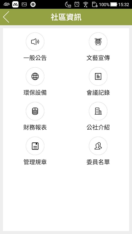 社區資訊類:社區資訊、各類公告、會議記錄、財務報表、委員名單...等。