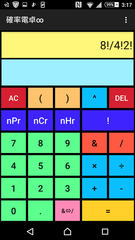 場合の数(順列、組み合わせ)や確率が簡単に計算できます。 確率の計算結果はもちろん分数で表示されます。