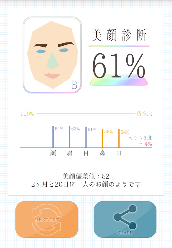 これであなたの美顔度が全体の中でどの辺に位置しているのか,どれくらいレアなのかが一目瞭然です!