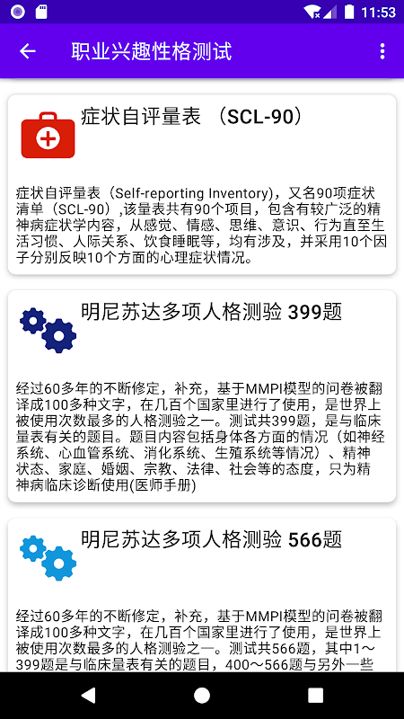 1. Scegli il tipo di scala di interesse professionale, PDP, DISC, MBTI, preferenze del cervello sinistro e destro, intelligenza standard, aspettativa di vita, quoziente emotivo standard (EQ), scala di autovalutazione dei sintomi (SCL-90), stile di apprendimento, ansia scala di autovalutazione (SAS), autotest per disturbo ossessivo-compulsivo, fobia sociale.