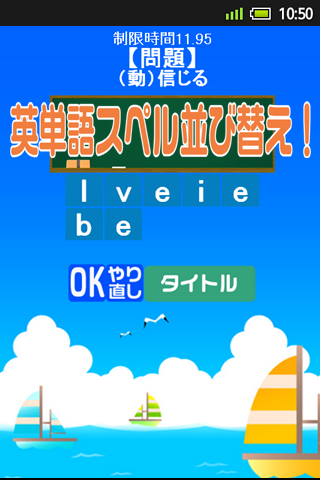 英単語のスペルを正しい順番で並び替えるゲームです。