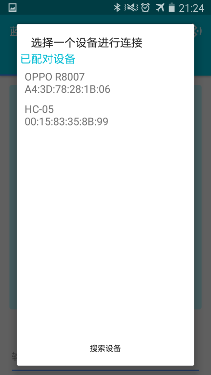 1. 搜索附近的蓝牙,找到你所需要调试的蓝牙模块,点击之后即可连接。在应用中,实现了搜索蓝牙并进行连接这一部分功能,在界面右上角也就是 menu 栏中,点击蓝牙图标,会出现一个 dialog ,显示手机以前连接过的蓝牙选项。dialog 下方有一个搜索设备按钮,点击之后,搜索附近蓝牙设备屏显示。