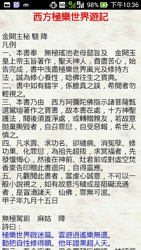 三、本書乃由 西方阿彌陀佛指示諸菩薩甄選鸞壇著作之寶書,故本書在處,十方神聖護法,閱後須置淨處,或轉贈親友,若故意拋棄撕毀者,自召罪愆,自受惡報,希世人慎之。