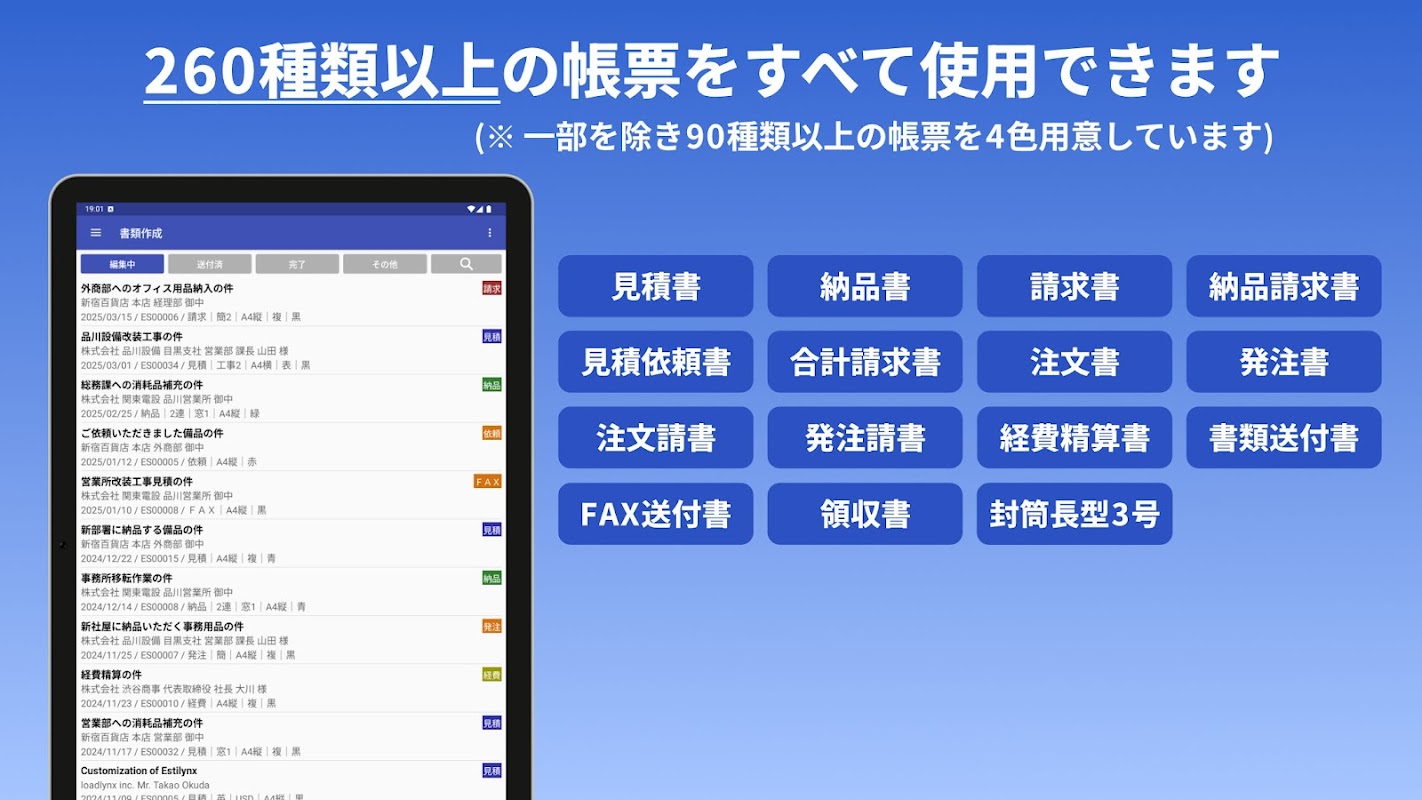 Si tratta di un'app per la creazione di documenti che consente anche alle persone impegnate di sfruttare in modo efficace il proprio tempo libero attraverso la "creazione semplice" e l'"output ordinato" di documenti come preventivi, bolle di consegna e fatture, ma anche ordini di acquisto, moduli d'ordine, richieste di preventivo, lettere di accompagnamento, ricevute, ecc., sia in ufficio che in viaggio.