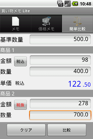 (Esempio:. 100g di 100 merci yen e 150g per la registrazione dei prodotti 140 yen a 100 g di serie, sarà la visualizzazione di 100 yen e 93 yen in lista di confronto)