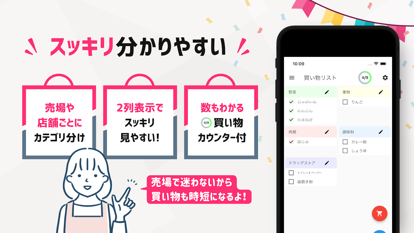 Una comoda app per appunti che può essere classificata. Il display a 2 colonne è pulito. Puoi vedere il numero totale di assegni a colpo d'occhio. Aggiungi facilmente all'elenco standard. Condividi con la tua famiglia utilizzando la funzione di condivisione. Puoi anche gestire il tuo inventario con la cronologia degli acquisti.