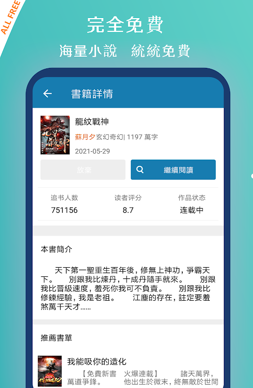 Una raccolta di romanzi amata da ragazzi e ragazze, con una vasta libreria di romanzi popolari di successo, ricchi di generi, che coprono romanzi rosa, romanzi di viaggi nel tempo, presidenti prepotenti, romanzi di combattimento di palazzo, coltivazione di fantasia, militari storici, fantascienza soprannaturale, horror e suspense, ecc.; rifiuta la carenza di libri, migliaia di romanzi originali hanno tutto!