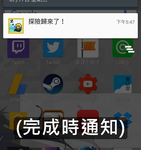 (手機若有自啟動管理,請設為白名單)一人開發小遊戲,bug所在多有望請回報。放置型RPG,設定探險條件並指定時間後即可離開遊戲,等待探險完成後手機會自動提示。