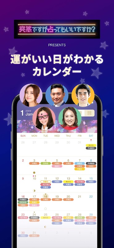 Posso improvvisamente dirti la mia fortuna nella trasmissione del lunedì di Fuji TV dalle 20:00? App Calendario da. Puoi facilmente scoprire i giorni fortunati come il giorno Ichigomanbai, il giorno Tensho, Taian, la luna nuova, la luna piena, ecc.