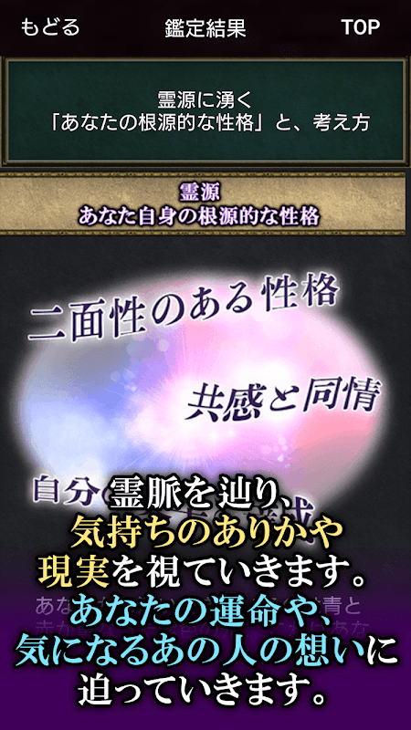 彼女の力を頼り、日々行列ができる、人気の鑑定をあなたのお手元でご堪能下さい。霊脈を辿り、気持ちのありかや現実を結んでいく、彼女の力が遂に解禁します。