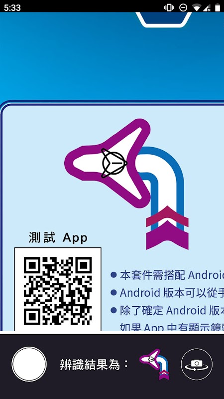 此 App 開啟後會在頁面中顯示使用者手機拍到的畫面,如果沒有顯示畫面就代表此手機不支援 Personal Image Classifier 套件,建議就不要購買『雙 V AI 自駕車』。如有順利顯示畫面,就可以對準『雙 V AI 自駕車』外盒上的左右轉箭頭並按下辨識鈕來辨識。