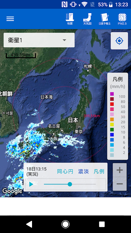 雨雲レーダーでは、地図画面中心からの同心円を描画できます。雨雲までの距離が一目で確認できます。