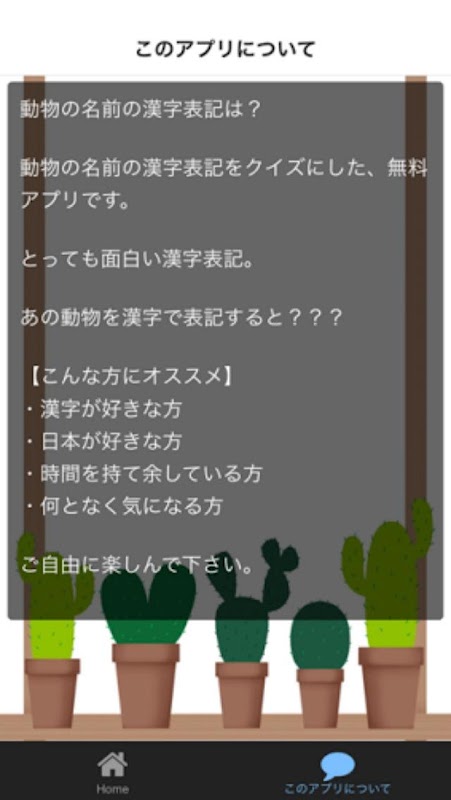 動物の名前の漢字表記をクイズにした、無料アプリです。