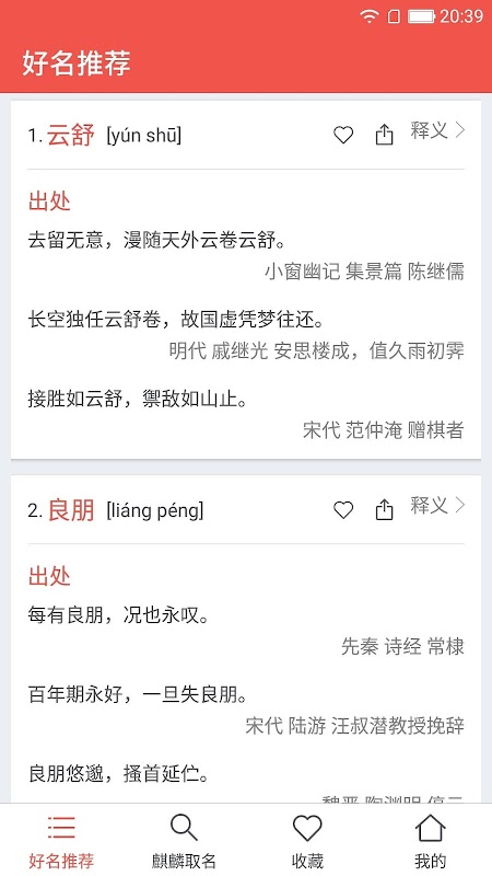 1.在唐诗宋词元曲、四书五经、诗经楚辞、易经、二十四史、传记游记中起名取名,有出处、意境好、音韵美。当之无愧的起名大师、取名神器、起名大全、取名宝典。