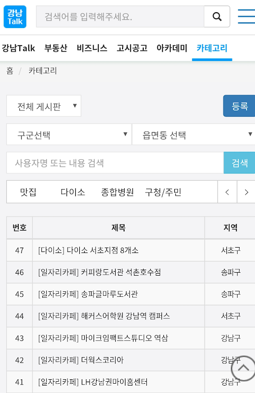 강남톡은 강남구, 서초구, 송파구 지역 내에서 일어나는 다양한 이야기를 공유합니다. 비즈니스 정보, 부동산정보, 기타 이벤트 및 각종 모임 정보를 공유합니다. 강남톡과 콜라보할 업체도 환영합니다. 이메일로 문의하세요 . 감사합니다.