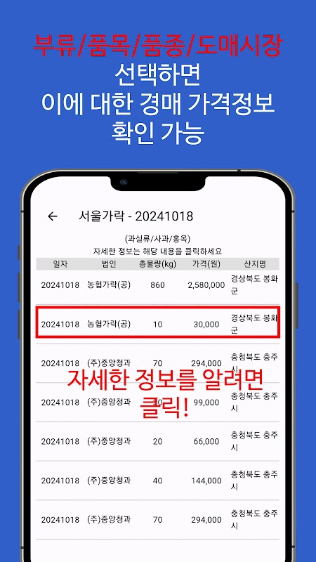 Nell'app puoi visualizzare facilmente i dettagli delle aste di prodotti agricoli e marini per articolo e mercato all'ingrosso nei principali mercati all'ingrosso del paese. Gli utenti possono selezionare l'articolo o il mercato all'ingrosso desiderato e visualizzare non solo i dettagli dell'asta in tempo reale, ma anche i dettagli delle aste passate, utili per comprendere le tendenze del mercato.