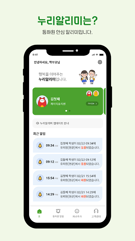 NuriAlimi è un servizio di rete di sicurezza che fornisce notifiche in tempo reale ai genitori dell'arrivo e della partenza dei propri figli.