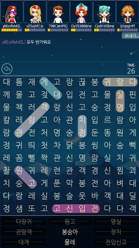 - 도전 모드 : 제한 시간내 단어를 빨리 찾아 다른 유저와 순위를 겨루는 방식