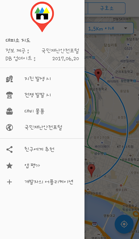 어플리케이션 내의 대피소 DB를 이용하여 대피소 위치를