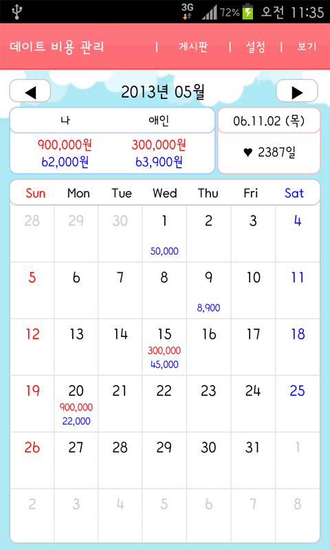 1. 달력 위 수입 및 지출 표시. (데이트 코스, 기념일 기록)
