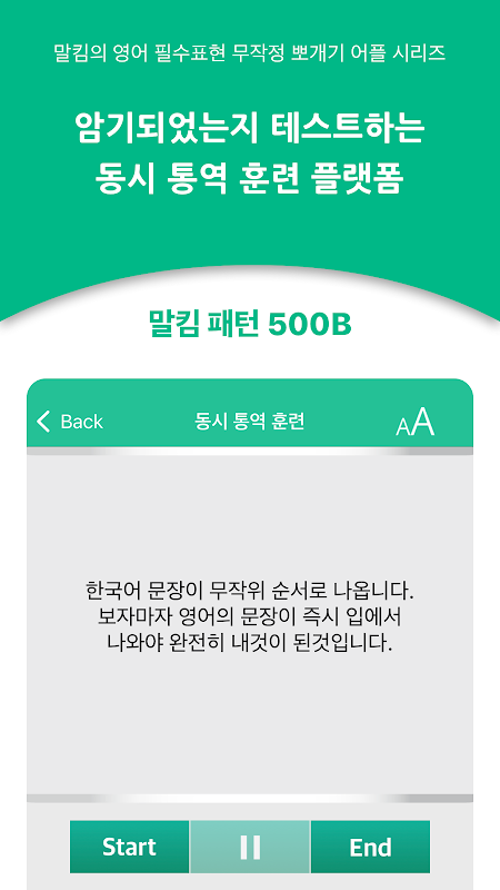 5. Ho creato un menu Test per assicurarmi che le frasi siano completamente interiorizzate nel mio. Se selezioni un intervallo di lezioni dal menu Test e premi il pulsante Avvia, le frasi nella lezione specificata verranno presentate in coreano in ordine casuale. Dopo un certo periodo di tempo, prima che esca la frase inglese, devi essere in grado di pronunciare la frase prima in inglese. Dovresti esercitarti il più possibile.