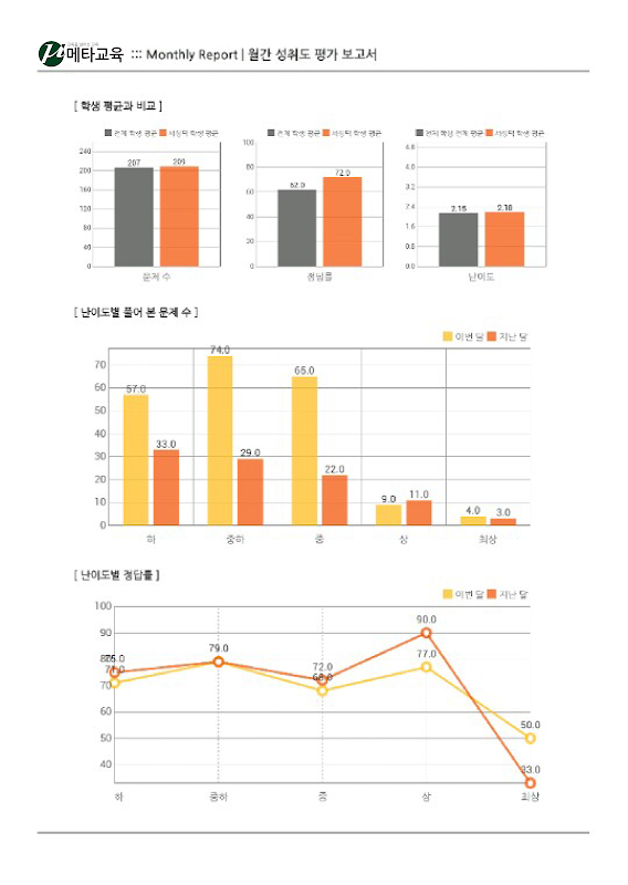 메타교육학원에서는 달마다 아이의 학업 보고서를 작성해 학부모님께 전달합니다. 아이의 문제 풀이 결과를 도표와 그래프 등을 통해 알기 쉽게 정리해서, 아이의 현재 학습 상태를 진단하기 위해서인데요.