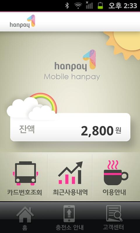 모바일 한페이 (Hanpay) 어플리케이션은 스마트폰 환경에서 기존 오프라인 교통서비스를 동일하게 이용하실 수 있으며, 실시간으로 잔액 및 내역을 조회할 수 있는 기능을 제공하는 서비스 입니다.