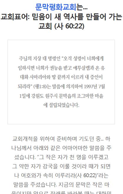 Mentre pregavo e mi preparavo per fondare una chiesa, Dio mi ha dato le seguenti meravigliose parole. Disse: "Il piccolo farà mille e il debole farà una nazione potente, e a suo tempo il Signore farà presto" (Isaia 60:22). Sebbene Munmak sia un piccolo villaggio ora, guardando al futuro, non diventerà solo il centro della Corea, ma anche un luogo di benedizione per fare una grande storia a cui il mondo sta prestando attenzione.E nel mezzo, la nostra chiesa gioca un ruolo centrale e la fede Come chiesa che fa una nuova storia, diventeremo una chiesa che scrive una nuova storia.