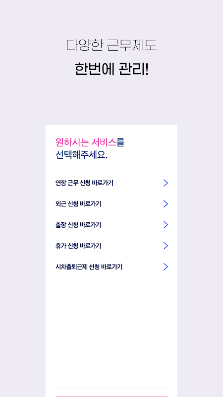 La gestione dell'orario di lavoro è un'app certificata dalla Korea Communications Commission e puoi gestire la gestione del tragitto giornaliero e le informazioni fuori sede con un'app mobile.