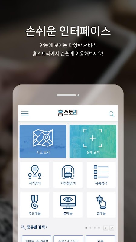 핵심기능 위주의 쉽고 간편한 화면으로 구성되어있어 누구나 부동산 서비스를 손쉽게 이용할 수 있습니다. 한번의 터치로 빠르고 손쉽게 원하시는 정보를 모두 얻을 수 있습니다.