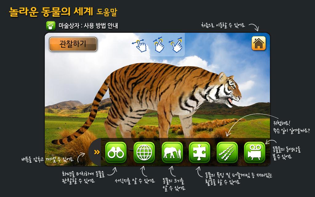 - AR(Augmented Reality, 증강현실)을 기반으로 다양한 증강현실 책의 이미지를 인식하여 페이지 별로 해당 내용과 연관된 증강현실 애니메이션을 보여주는 어플리케이션 입니다.