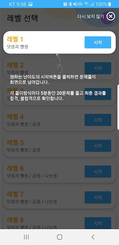 블루케어 암산교실은 덧셈, 뺄셈, 곱셈, 나눗셈 그리고 사칙연산을 단계식으로 공부할 수 있는 애플리케이션입니다.