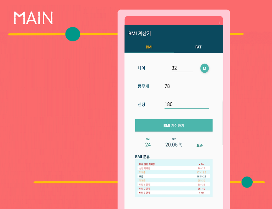 이 어플은 나의 BMI와 FAT 수치를 계산하기 위한 어플입니다.
