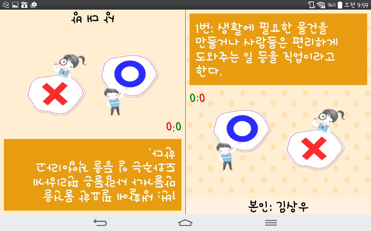 다. 사회 마주보기: 2인용으로서 스마트폰을 가운데 두고 친구와 마주앉아 퀴즈를 풀며 자신의 승율 쌓기