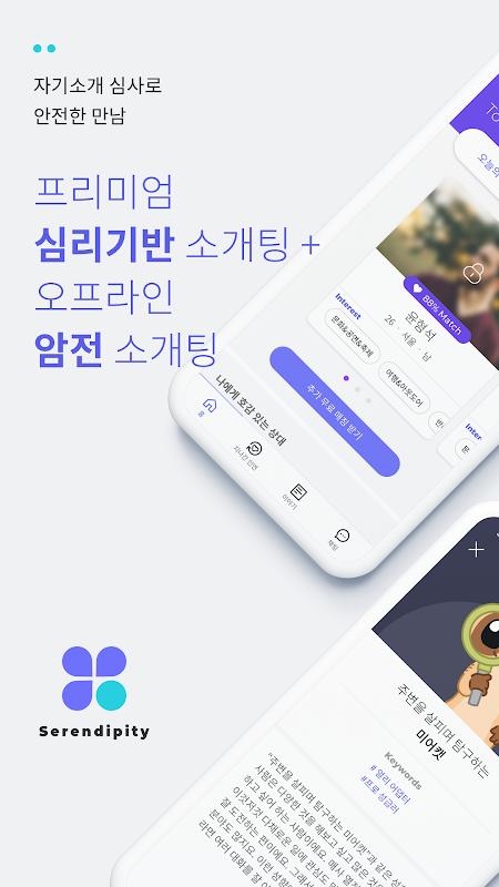 당신과 정말 잘 맞을 소울메이트가 있을까요? 한 번도 만난 적은 없고, 현실적으로 모든 사람을 만나볼 수없어서 찾기 어렵지만 어딘가에는 정말 당신과 잘 맞는 사람이 있지 않을까요? 세렌디피티는 그런 바람을 이루어드립니다. 심리학을 통해서 소울메이트일 수 있는 사람 혹은 그와는 반대의 매력을 가진 사람, 랜덤매칭을 통해 우연이 이어주는 인연을 만날 수 있습니다.