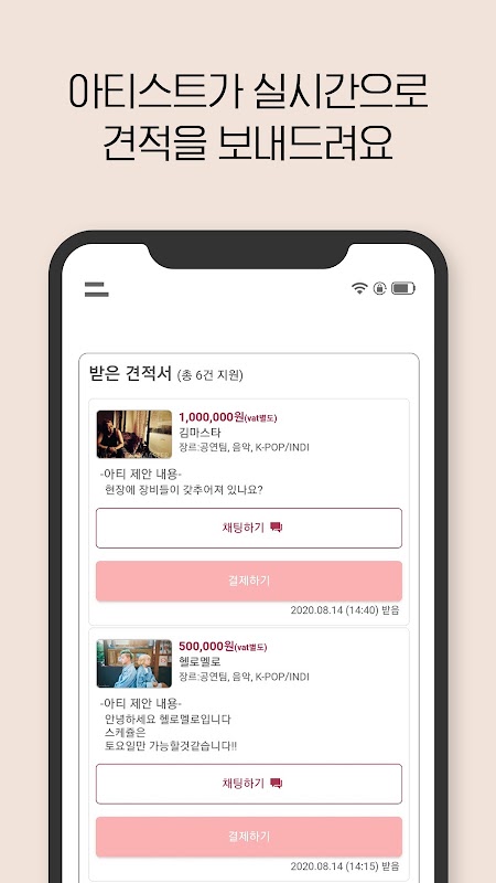 실시간으로 아티스트에게 견적 받고, 채팅으로 협의, 계약까지 한번에 OK!