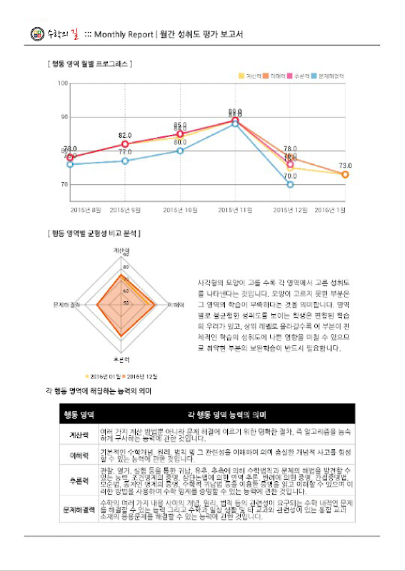 '수학의 길'학원에서는 달마다 아이의 학업 보고서를 작성해 학부모님께 전달합니다. 아이의 문제 풀이 결과를 도표와 그래프 등을 통해 알기 쉽게 정리해서, 아이의 현재 학습 상태를 진단하기 위해서인데요.