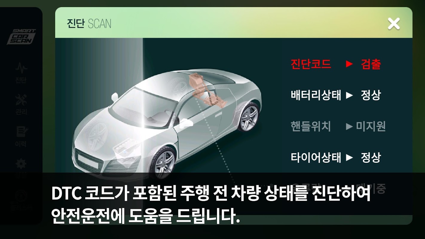 - 챠량 상태를 자동으로 진단함은 물론 소모품 규격과 주행 거리에 따른 예방 정비 정보를 제공하여 차량 관리에 도움을 드립니다.