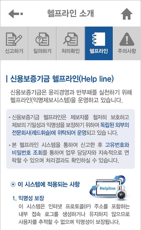 언제 어디서나 실시간으로 편리하게 헬프라인 익명신고와 준법질의가 가능하고,