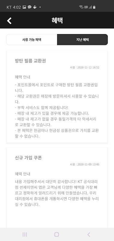 4) 혜택: 우리 대리점에서 고객님께 제공하는 다양한 메시지를 확인하고, 매장에 방문해서 받으실 수 있는 혜택을 볼 수 있습니다.