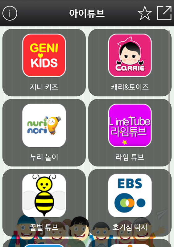 지니 키즈, 캐리와 장난감 친구들, 누리 놀이, 라임 튜브, 꿀벌 튜브, 호기심 딱지(ebs), 뽀로로, 애니킹 등 아이들이 좋아하는 유튜브 영상을 편리하게 볼 수 있도록 모아 놓은 앱입니다.