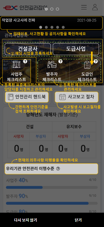 안전길라잡이는 한국도로공사 직원이 가지는 세 가지의 법적 지위(사업주,발주자,도급인)의 안전의무사항에 대해 안내하는 시스템입니다.