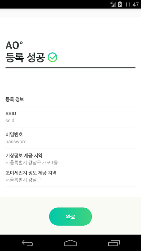 이 앱을 통해 Wi-Fi와 외부 환경정보를 설정하면, 내가 원하는 지역의 공기정보를 에이오 화면에서 실 시간으로 확인할 수 있습니다.