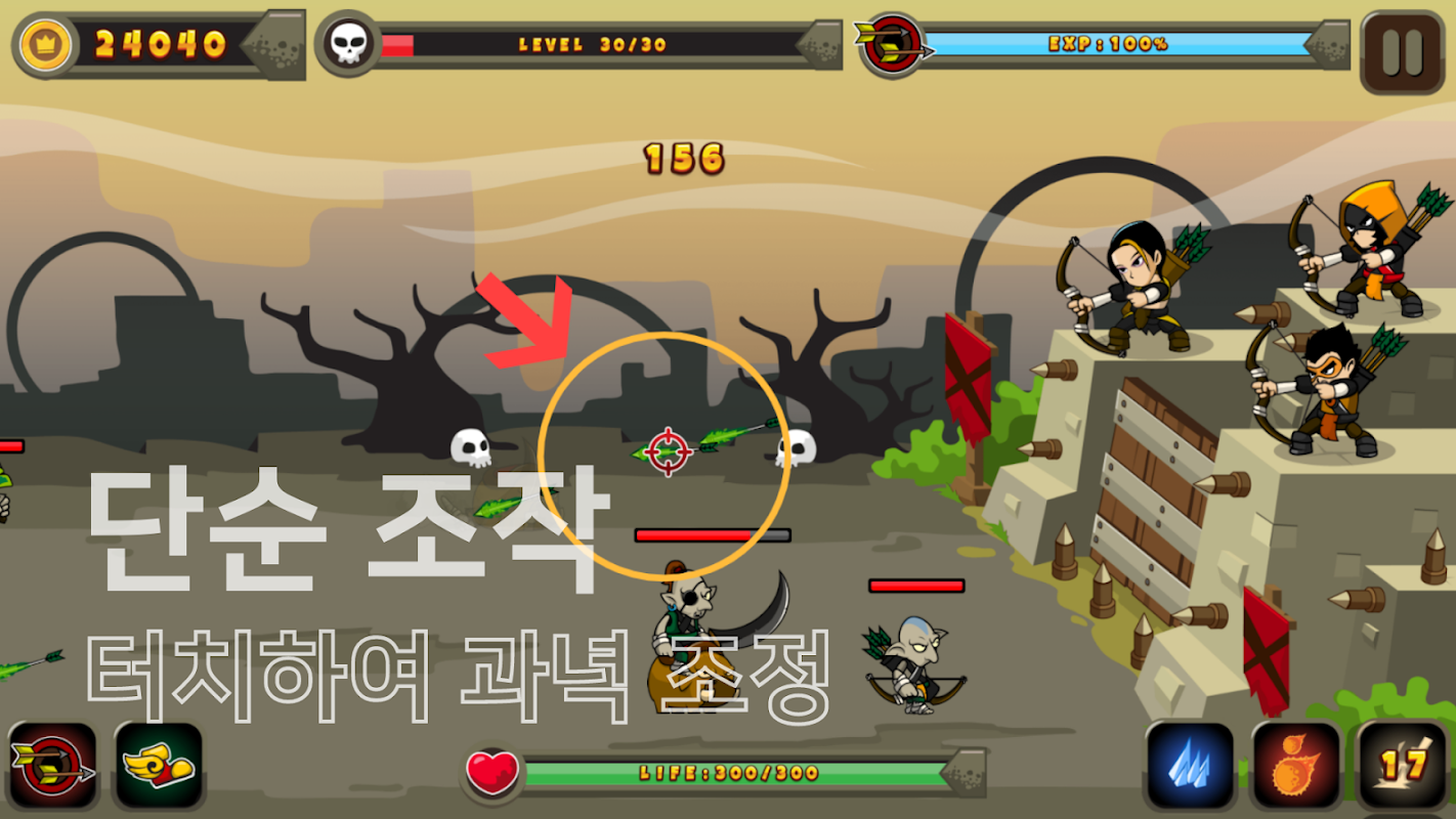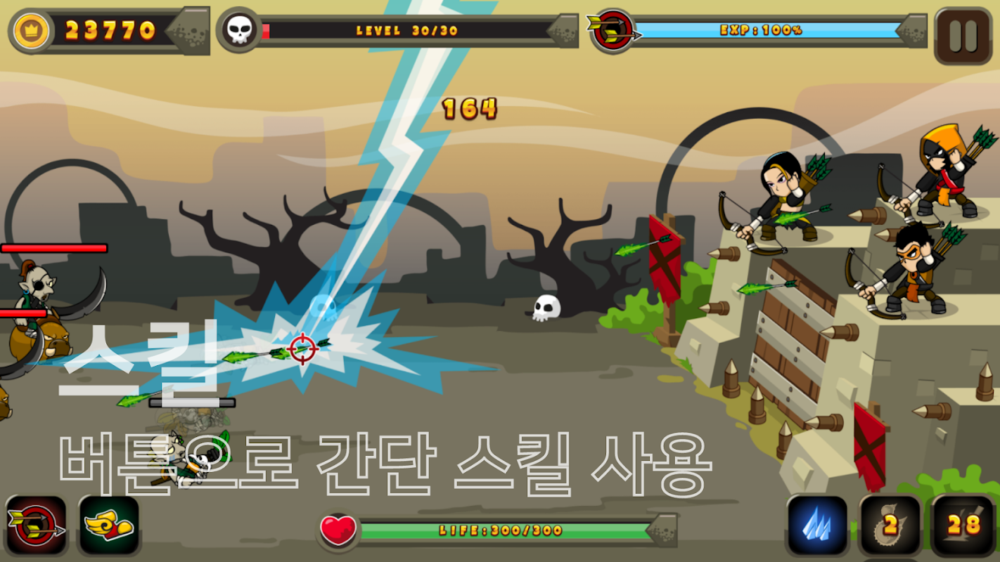 EXP를 소모하여 일정 시간동안 화살 발사 지연 시간을 줄일 수 있습니다. 또는 3가지 특수 스킬을 이용하여 일정 범위 내의 몬스터들을 한번에 물리칠 수도 있습니다.