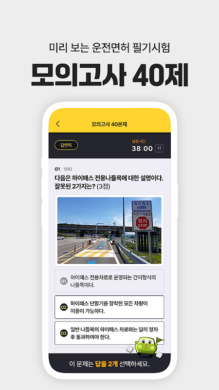 - 실제 운전면허 학과시험 시간과 동일하게 40문제를 풀어보고, 모의합격여부를 즉시 확인해볼 수 있는 기능 제공.