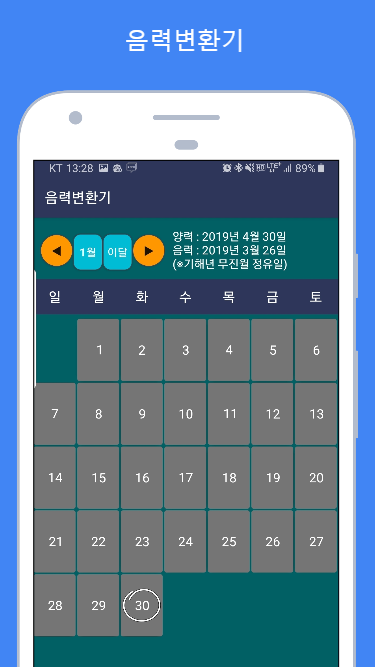 달력을 음력으로 볼 수 있으며, 특정일을 선택하면 음력일의 모든 간지정보를 볼 수 있어요.